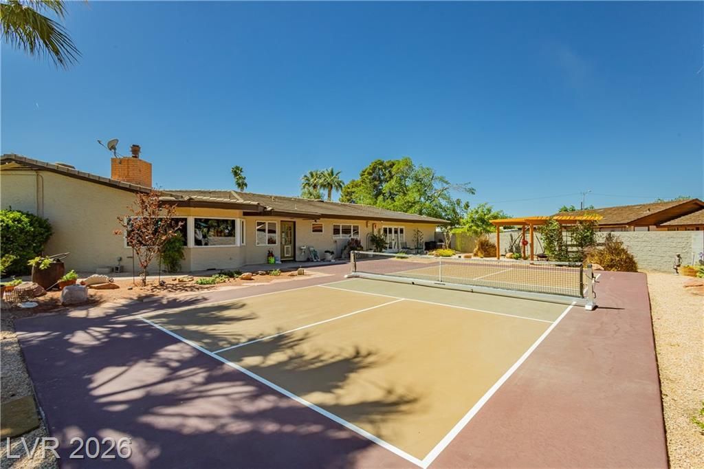 Spacious single-story estate on a .6 acre lot with no HOA, featuring 5 bedrooms and 5 bathrooms, each bedroom offering direct access to a bathroom. This home showcases timeless character with wood flooring, custom cabinetry, exposed beam ceilings, and multiple living and entertaining areas. The kitchen includes ample cabinetry, a large island, and opens seamlessly to the main living spaces. A separate game room with built-in bar adds to the home's versatility. The backyard is designed for both relaxation and recreation, complete with mature landscaping, expansive patio areas, and a private pickleball court. Additional features include a circular driveway, ample parking, and an oversized 2-car garage. Centrally located near shopping, dining, and everyday amenities. THIS PROPERTY IS LOCATED ON TWO PARCELS: 162-02-311-048 AND 162-02-311-049 ARE BOTH SOLD TOGETHER.