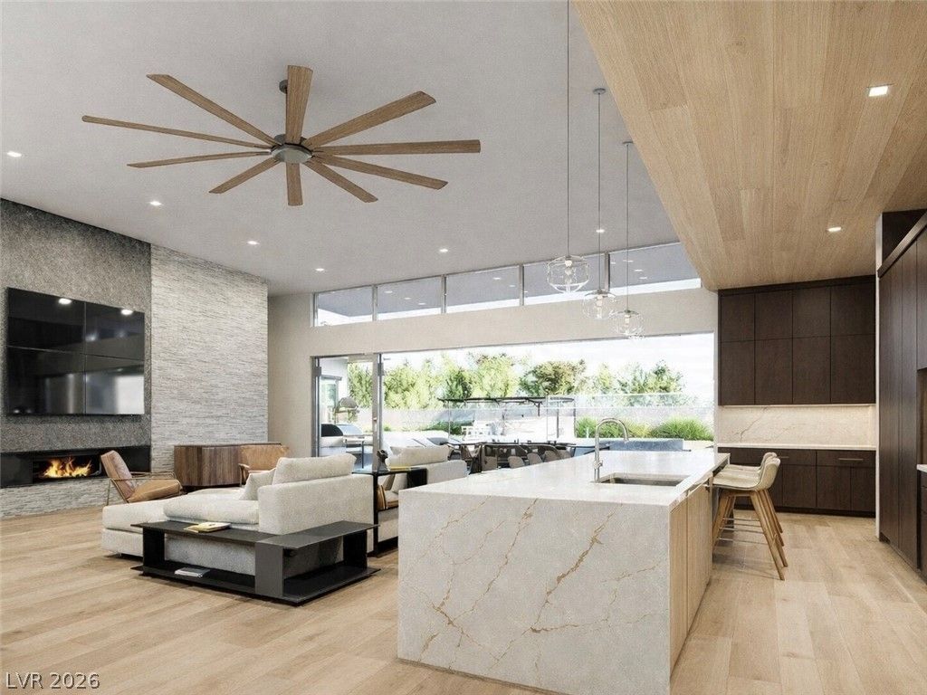 Experience elevated desert living in this stunning modern custom estate set on a 1.35-acre homesite with breathtaking mountain and valley views. Designed and built by Paradise Estates, this single-story residence offers a seamless open-concept layout filled with natural light and clean architectural lines. The chef's kitchen features custom cabinetry, premium quartz countertops, and a dramatic waterfall island, flowing into an expansive great room anchored by a sleek contemporary fireplace. Indoor-outdoor living is effortless with covered patios, a built-in outdoor kitchen, exterior fireplace, and RV hookups for added convenience and flexibility. Every detail reflects quality, space, and modern luxury in a serene setting just outside Las Vegas. To be built. Approximately 3,567 sq ft, 4 bedrooms, 3.5 bathrooms, 3-car garage, energy-efficient construction with fully owned solar included. Optional upgrades may include pool, spa, and RV garage.